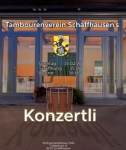 In 2 Wochen ist es soweit. Dann präsentiert der Tambourenverein Schaffhausen sein Konzertli@Trülli. Wir freuen uns auf viele Zuschauer. Für Getränke und Kuchen ist gesorgt.